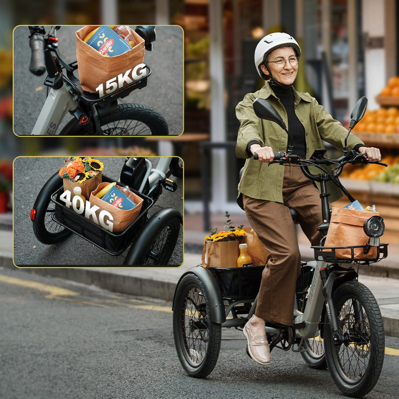 Personal Use Storage: Front basket supports up to 15 kg, rear basket up to 40 kg. Max total load (rider + baskets): 180 kg